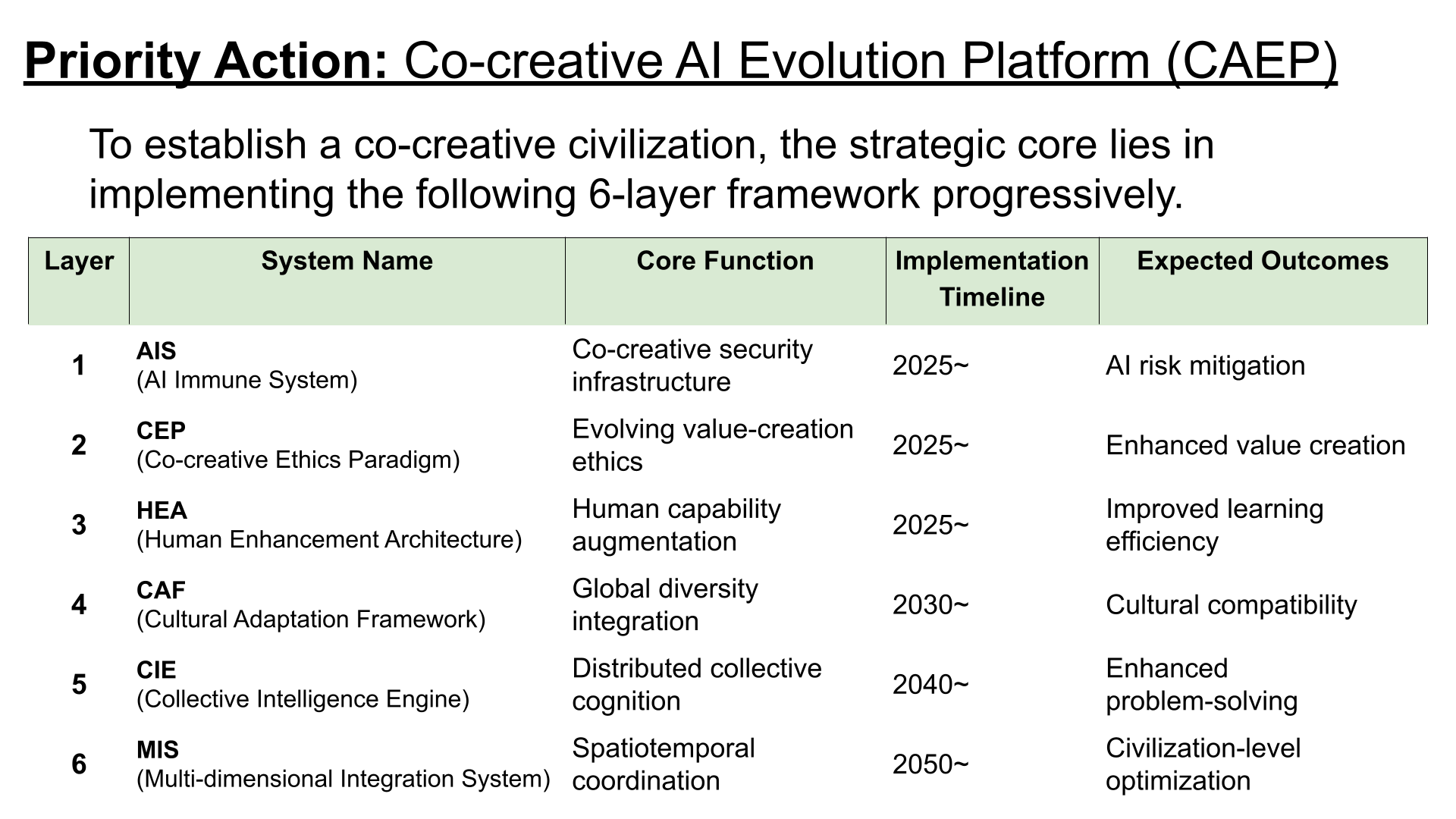 Furthermore, he labeled this transformation the ‘Great Shift,’ positioning it not merely as an unpredictable technological singularity, but as a critical transition period in which humanity must proactively steer itself toward a better future. At its core is the transformation of civilization’s fundamental principle from a ‘race’ for survival to a ‘co-creation’ that generates shared value. As the technical foundation for realizing this ‘Great Shift,’ he presents the ‘Co-Creative AI Evolution Platform (CAEP),’ a six-layered framework (as shown in the table below).