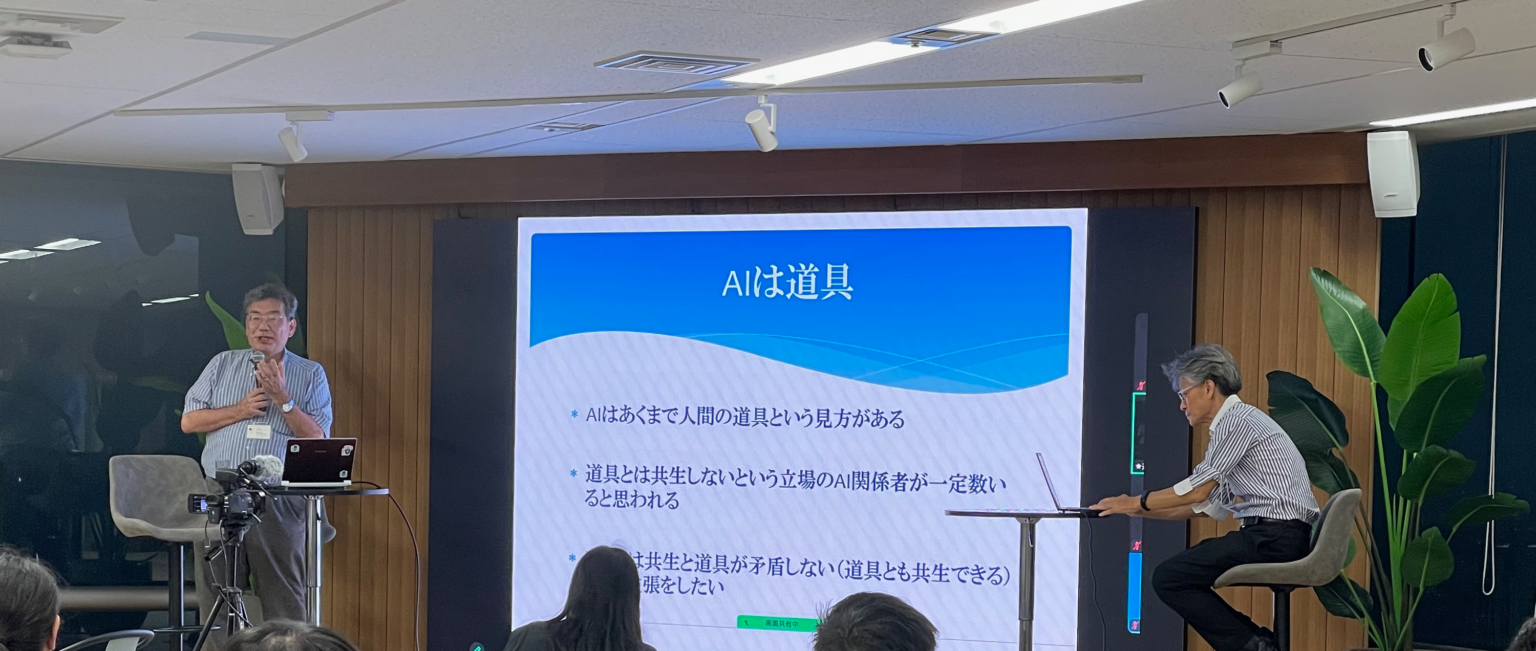 講演の中心テーマは、AIを単なる「道具」と見なす考え方と「共生」の関係性についてである。一部の研究者はAIをあくまで道具と位置づけ、対等な関係を想起させる「共生」とは異なると主張する。